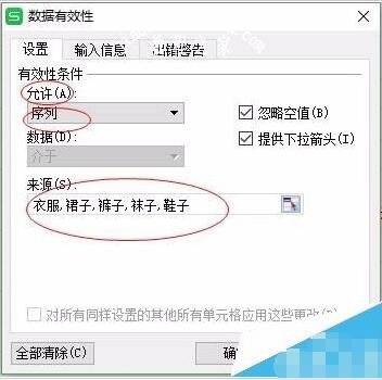 在数据有效性的弹窗窗口中,将“允许”选择“序列”,在“来源”的地方将刚才复制的数据粘贴进入,最后选择确定。