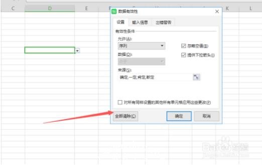打开数据有效性的对话框,点击左下角的全部清除按钮。