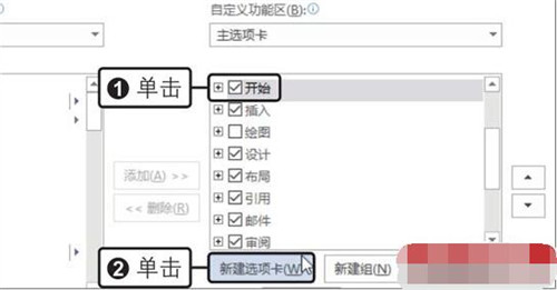 单击“自定义功能区”列表框中的“开始”选项,单击“新建选项卡”按钮,如下图所示。