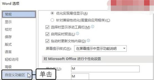 启动Word 2019,打开“Word选项”对话框,单击“自定义功能区”选项,如下图所示。