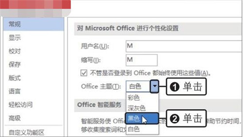 弹出相应的选项对话框,在“常规”选项面板中单击“Office主题”右侧的下三角按钮,在展开的列表中单击“黑色”选项,如下图所示。