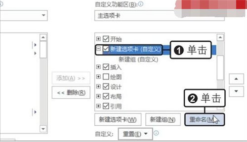 此时在“开始”选项卡下方新建了一个选项卡,且包含一个新建组,单击“新建选项卡(自定义)”选项,单击“重命名”按钮,如下图所示。