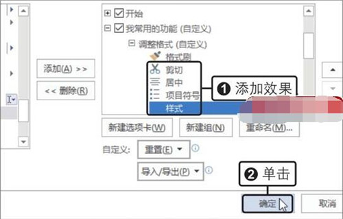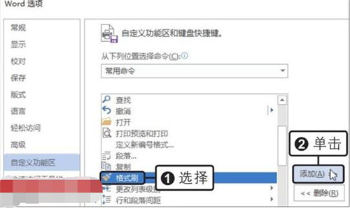 在左侧的列表框中找到并选择要添加的功能,例如选择“格式刷”按钮,单击“添加”按钮,如下图所示。