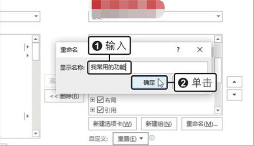 弹出“重命名”对话框,在“显示名称”文本框中输入“我常用的功能”,单击“确定”按钮,如下图所示。
