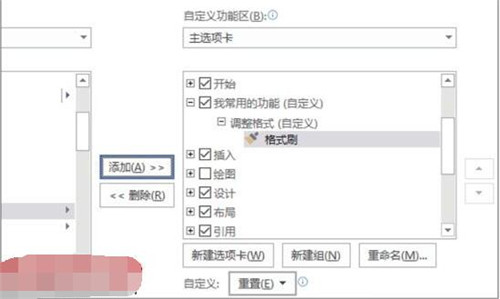 此时在右侧列表框的“调整格式(自定义)”组下,添加了“格式刷”按钮,如下图所示。