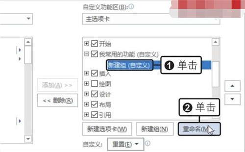 此时可以看见新建的选项卡被重新命名,单击“新建组(自定义)”选项,单击“重命名”按钮,如下图所示。