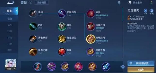 无尽战刃可为暴击伤害加持,破晓主物穿必不可少,这套出装后期仅需一个21A或31A连招,即可瞬秒敌方后排,伤害量非常到位。