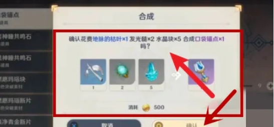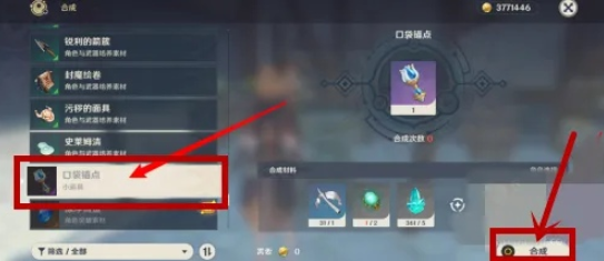 3、在合成台页面,点击上方的“合成”选项,然后在列表中选择“口袋锚点”。在确认所需的材料无误后,点击“确认”即可开始合成。