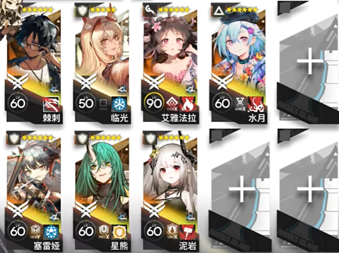 干员:棘刺、塞雷娅、临光、星熊、艾雅法拉、泥岩、水月