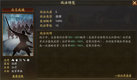 战斗中,我军全体统率提升10-20(受各自智力影响),且自身获得7层兰心效果,每层使自身造成和受到伤害降低5%-10%;