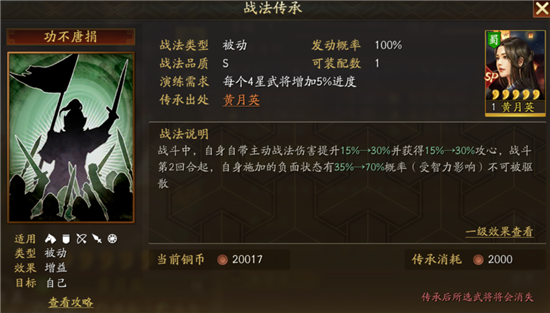 【功不唐捐】是全兵种的被动战法,能有效提升自身主动战法的伤害并获得攻心效果,第二回合起还能有几率使自身施加的负面效果不可被驱散。概而言之,【功不唐捐】稳定提升了伤害输出并尽量保证了负面状态的生效,可谓负面状态输出武将的“利器”!