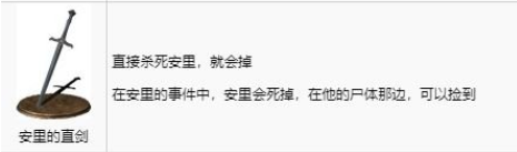 这把剑可以说是曾经的神器了,但削弱之后沦为了情怀武器,但还是比较不错。在最高等级下,安里的直剑有直剑排名第三的物理面板(仅次于长剑与阔剑)。自身带有祝福效果,不能质变,可以附魔。