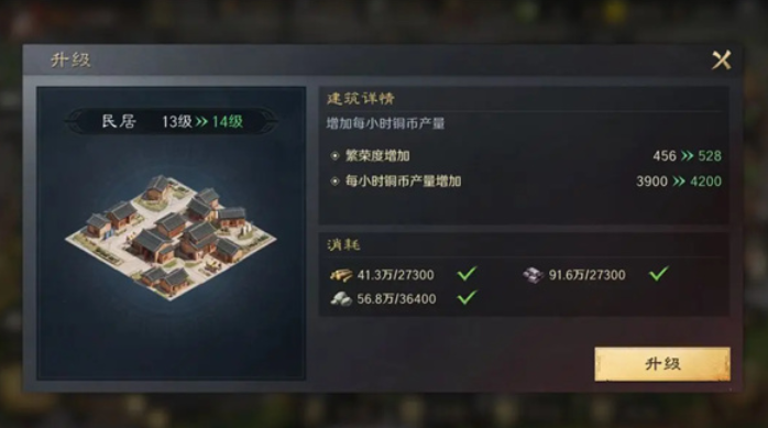 升级内城中的建筑等级可以提升繁荣度,升级级别越高提升的繁荣度越高。