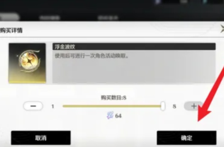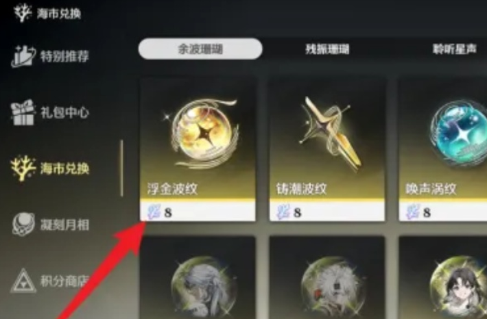 4、在海市兑换的界面中就可以找到浮金波纹并点击,自由选择需要的数量既可以成功兑换。