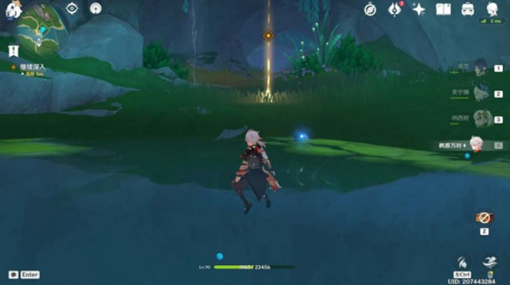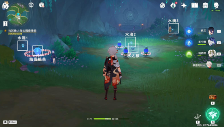 5、与其他人分头调查线索,进行解密,首先拾取水滴1-3,将水之核安置在底座上,随后等待芙宁娜3人找到隐藏的3个侦测晶体,等待6个侦测晶体汇聚中间,解锁结晶机关,之后攻击1次结晶机关(蓝-灰),等待机关开启。