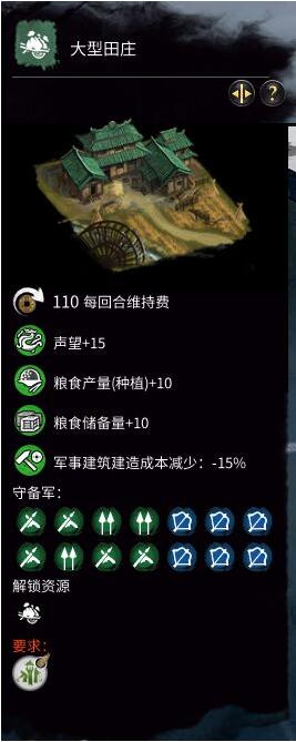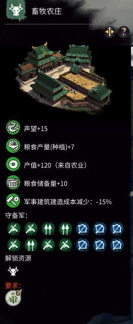 曹操开局所占的陈郡就是这样的一个粮食基地,粮食产出的建筑有自带的畜牧场和农庄,大家看到的是升到满级的畜牧场和农庄,那我们还可以建造一个拓土序列的豪强田产。