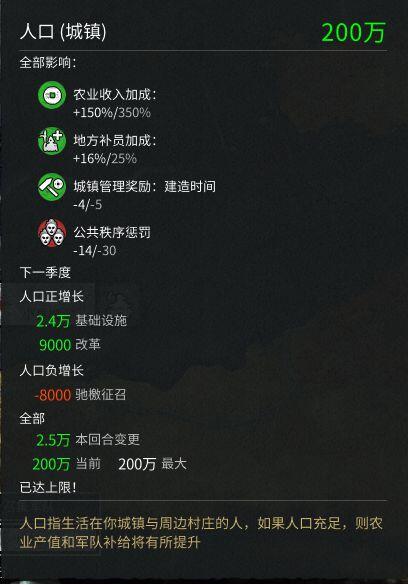 随着城市等级的提升,人口上限也会提升。相应的,在粮食充足秩序为正的情况下人口会自动增加直至达到上限。要注意一下的是如果人口过多,会导致你需要占用两个建筑槽来建秩序建筑。这样会大大降低这座城的金钱或者粮食产出效率,所以并不是每座城都满级才好。