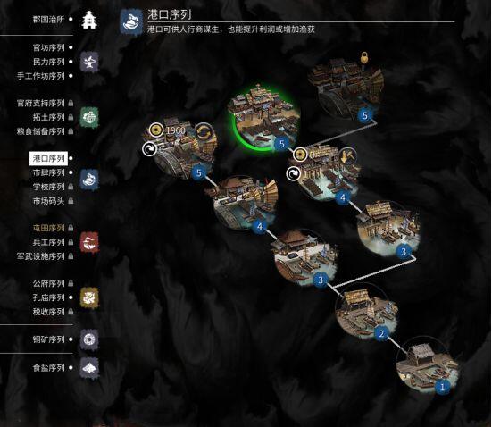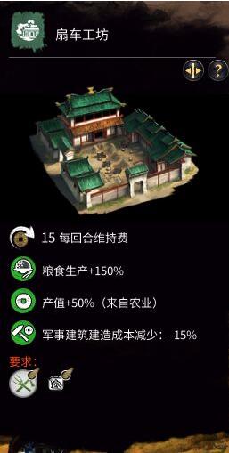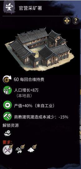 差点忘了说,钱城在粮食够用的情况下可以10级,以便最大化产出。10级城6个建筑槽,留一个反腐一个孔庙还有4个建筑槽。那么我们先建两个提升工业产值的,民力序列的官营采矿署,手工作坊序列的漆器将作监。