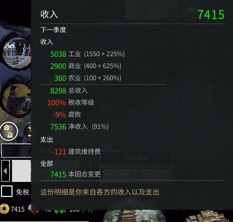如图,7级满农业建筑的陈郡收入不算贪腐共出产金钱1521,一座高级城才产这么点钱,农业收入显然不可龋