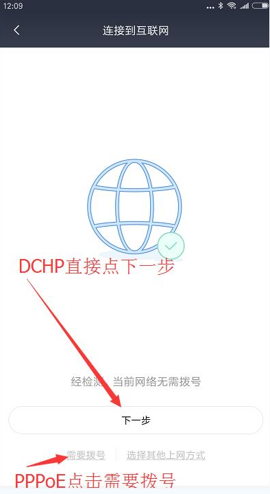 5.小米路由器进入自动检测上网方式,我的是DCHP无需拨号的,就直接点下一步(如果您是PPPoE拨号的话,就要输入用户名和密码(就是宽带账号跟密码)) ,如图: