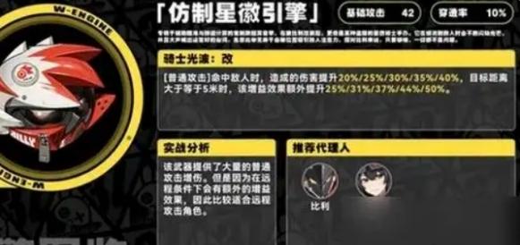绝区零游戏中的仿制星徽引擎是A级音擎,专为远距离攻击设计,能提升对远距离目标的物理伤害。不推荐抽取。