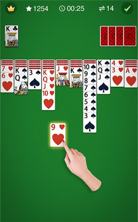 鼠标拖动移动一张或一组牌到另一张牌的上面或空牌叠。每次移动的牌都只能放在一叠牌全部移除后的空白位置或者比它最下面的一张牌大1点的牌之上。