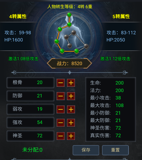 转生:通过元宝,灵符,修为丹可以获得修为,修为可以提升转生重数。每重可以获得6点自由分配的属性点数,增加生命,法力,最小攻击,最大攻击,最小防御,最大防御,神圣伤害,真实伤害。转生重数达到10重后可以消耗转生材料提升转数,提升攻击,生命值,攻击倍数。