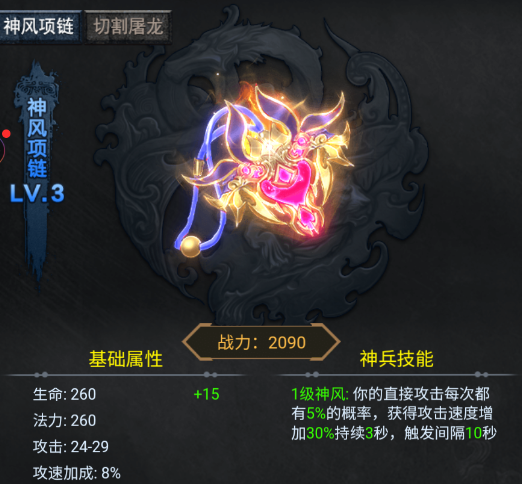 神风项链升阶增加生命,法力,攻击,攻速加成。技能升级增加攻击速度,使直接攻击有几率触发攻击速度加成。