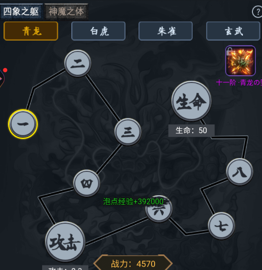 四象之躯分为青龙,白虎,朱雀,玄武。提升阶数可获得特殊属性分为增加HP加成,生命和伤害加成。攻击和准确,伤害减少和闪避。提升层数可获得基础属性攻击,防御,生命,法力,神圣伤害,真实伤害。固定防御。分别需要消耗青龙琥珀,白虎魄珠,朱雀炽翎,玄武涎香和元宝可通过击杀BOSS,商城,活动,获得升阶材料。