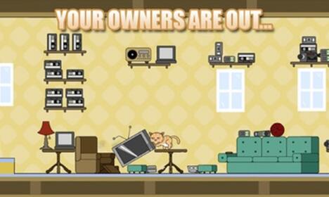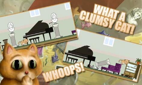 2.设置了很多关卡,获得的金币可以增强猫的破坏力,砸东西可以赚更多,主人更开心。